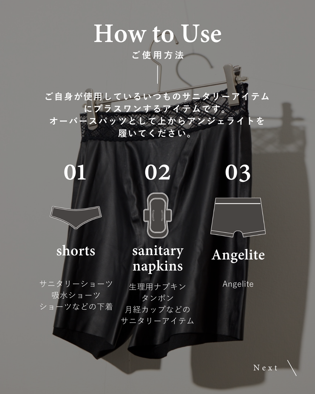 ナプキンをつけたショーツやサニタリーショーツの上にプラスワンしてご使用ください。